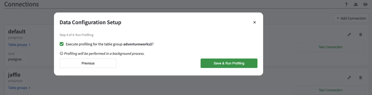 In the next step, you will be asked to run data profiling after setting up your Table Group. You will see a dialog box that looks like this.