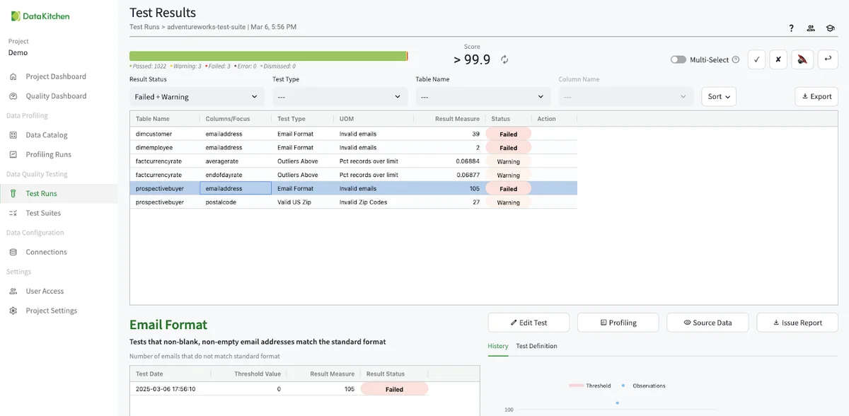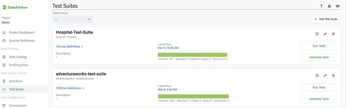 After investing just 10 minutes with TestGen in this quickstart, you get a data catalog, profiles on the data, a list of data hygiene issues, and automatically generated tests that you can use to monitor data quality; the results of the first run of those tests, and a data quality scoreboard.