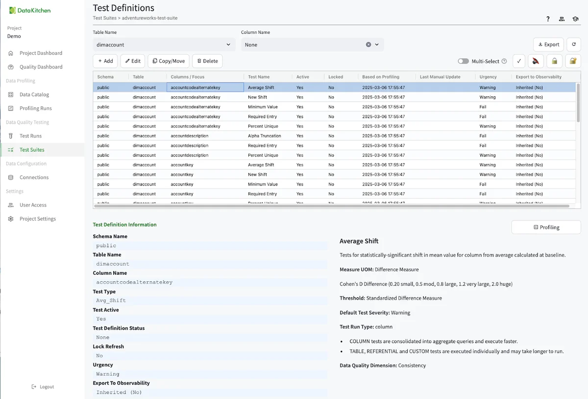 The next step is to Generate Tests by navigating from the 'Test Suit' you just created and hitting the 'Generate Tests' dialog. This will give you over 1000 tests on each column and table. To view and edit the list of tests, click on the test definitions dialog: