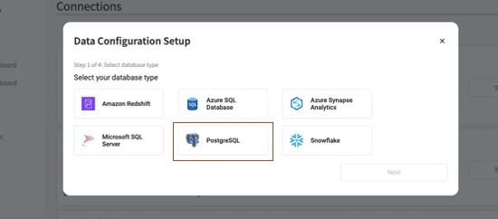 Click on the 'PostgresSQL' box, and you will be taken to a dialog box to configure the connection to the Postgres database.