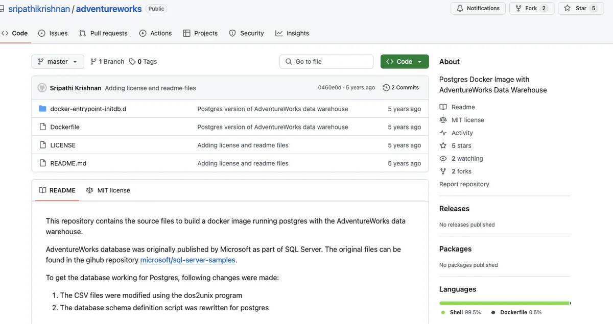 To enable you to use this walk-through, you can use Docker to quickly build an example PostgreSQL data source against which you can run scans for data quality. The example data source contains a data warehouse for AdventureWorks, an imaginary online e-commerce organization. Microsoft created the AdventureWorks data warehouse example data. In this example, we use a handy pre-build docker container from Sripathi Krishnan on Github that creates a docker container filled with AdventureWorks data in a few clicks. Please go to this link and follow the instructions to build the Postgres database and get it running on your machine.