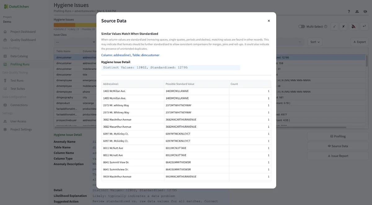 You can click the source data to get a sample and learn more about any issue. Here, for example, we can see address data that is close but not exact.