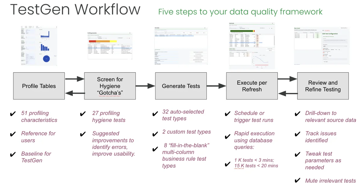 After investing just 10 minutes with TestGen in this quickstart, you get a data catalog, profiles on the data, a list of data hygiene issues, and automatically generated tests that you can use to monitor data quality; the results of the first run of those tests, and a data quality scoreboard.