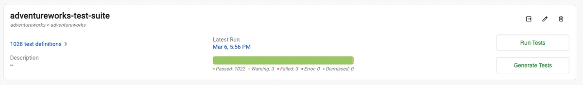 Finally, you need to run the tests. You can do this from the UI, the TestGen CLI, or by integrating with your scheduler or orchestrator. Below, you should click the 'Run Test' button from the AdvetureWorks Test Suite.