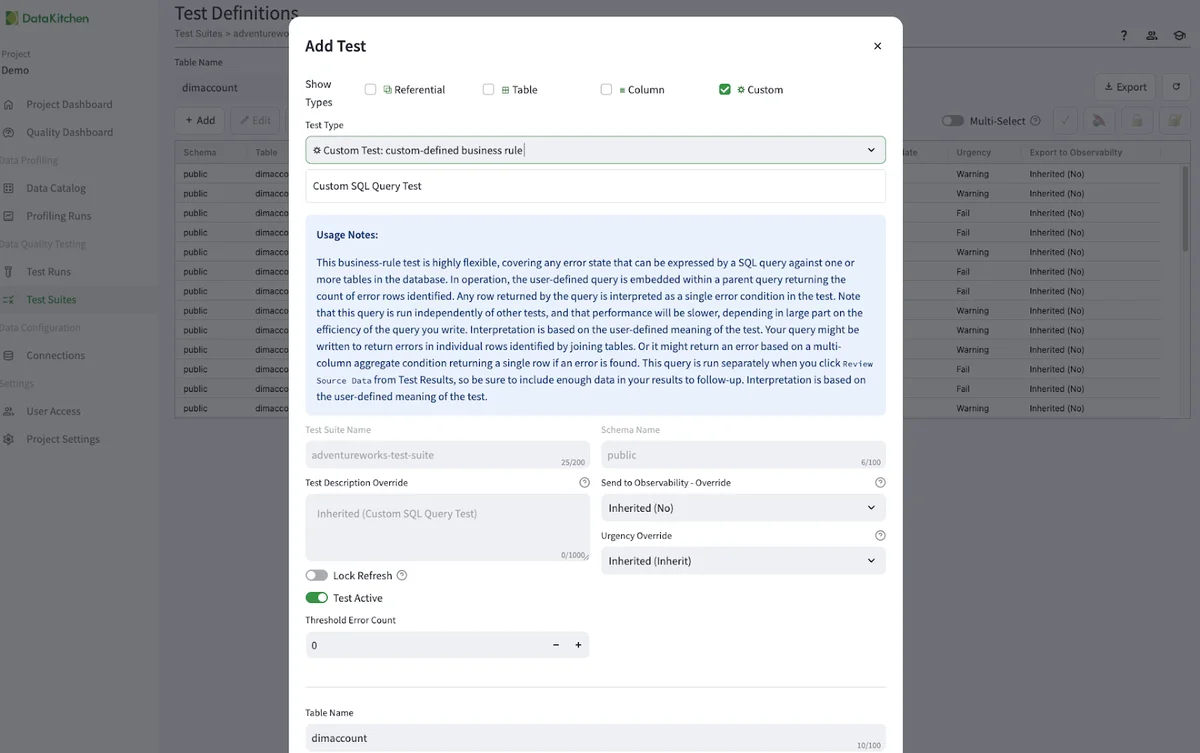 DataKitchen thinks you can get 70-80% coverage in all the data quality tests you need through our generative test engine. However, some industry-specific tests require a level of customization that AI alone may not capture. These tests, however, should not be buried in complex code repositories. They should be shareable and visible. This approach ensures that critical domain-specific data quality checks remain scalable and manageable while allowing organizations to benefit from automation wherever possible. The remaining 20% of domain-specific custom tests should be where you focus your time. This is where you can add real value to the business instead of just being a data plumber. Below, we see an example of the UI used to create a custom test:
