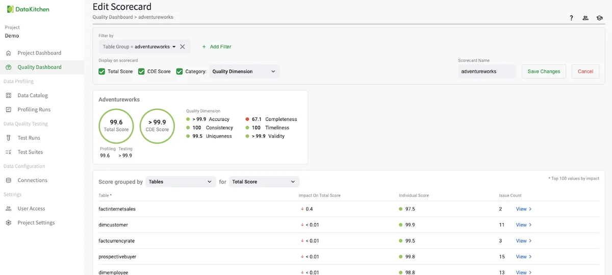Clicking on the 'Score Explorer' in the UI allows you to create a custom data quality dashboard based on specific elements such as Critical Data Element (CDE), business goal, data source, data customer, and other metadata. With the right dashboards, your organization can move confidently toward its data-driven goals and ensure that decisions are built on a solid foundation of high-quality data. You can gain influence and success in your organization as a data quality leader!
